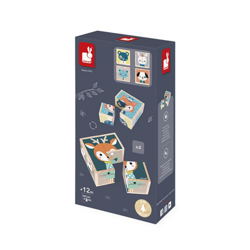 Los 6 Cubos de Madera de Janod permiten a los peques crear distintas imágenes de animales al combinar los cubos correctamente.