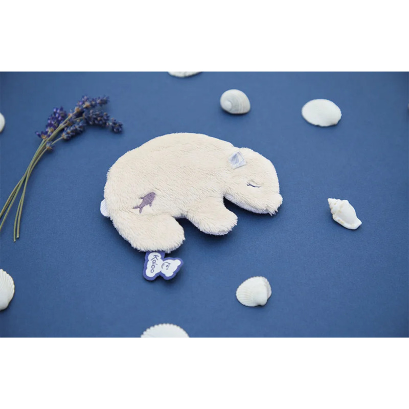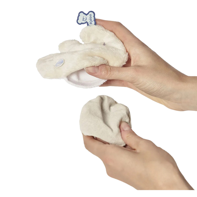 Esta bolsa calmante con forma de oso está hecha de dos materiales:suave pelo blanco y algodón de rizo.