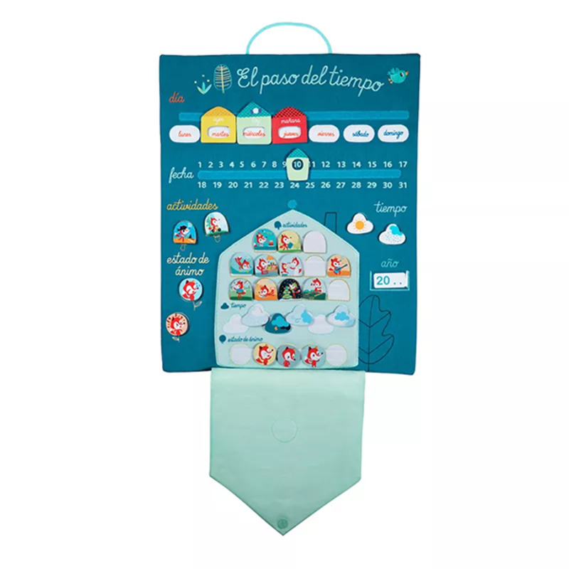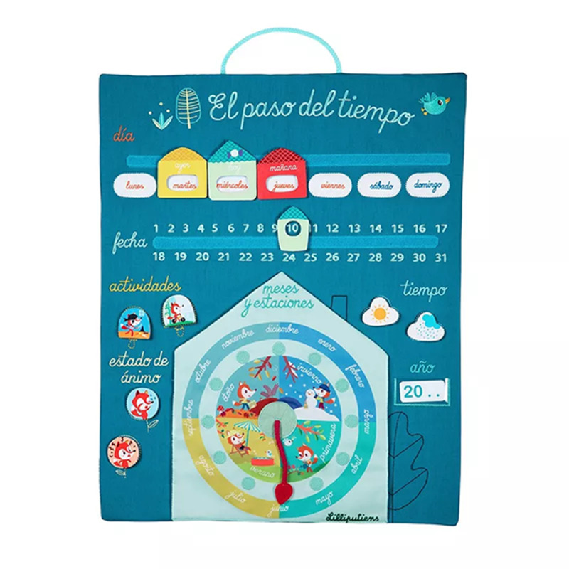 El calendario de tela "El Paso del Tiempo" de Lilliputiens es una herramienta educativa interactiva que enseña a los pequeños el concepto de tiempo de manera visual y divertida. Con sus piezas de velcro, los niños pueden aprender sobre los días de la semana, los meses, las estaciones y el clima. Además, incluye tarjetas para mostrar actividades diarias y estados de ánimo, promoviendo la autonomía y la comprensión diaria.