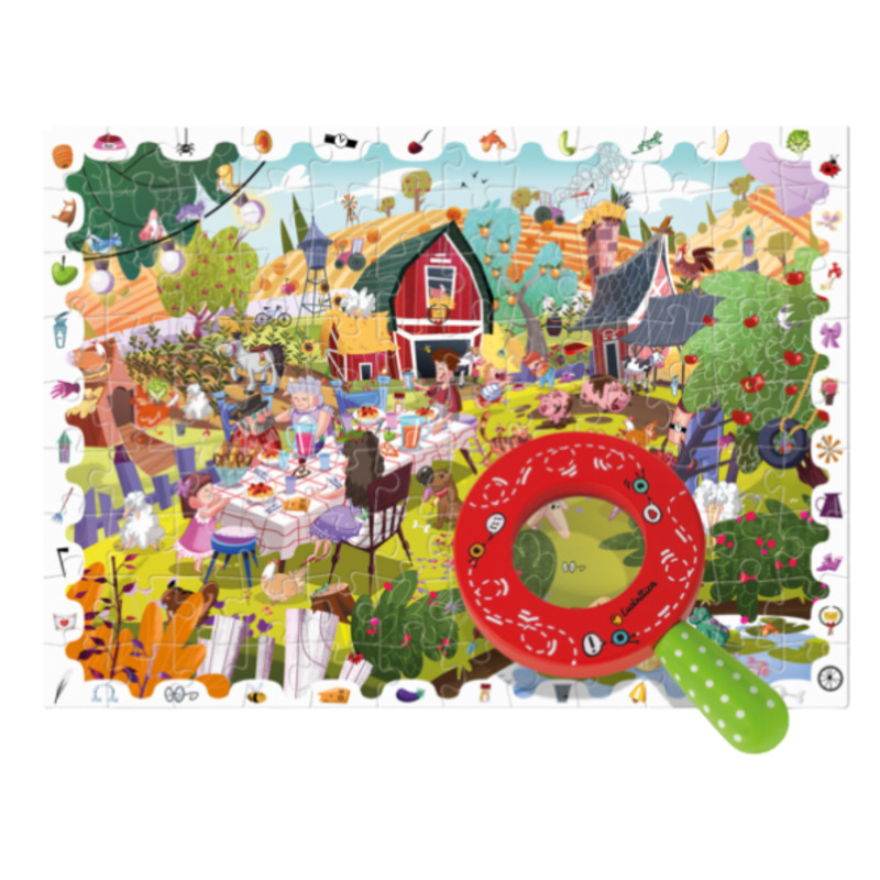 Puzzle infantil granja con ilustraciones secretas – 108 piezas + lupa de madera (Ludattica)