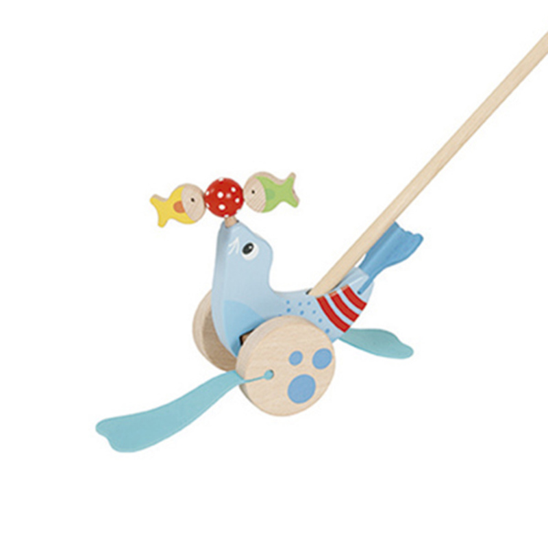 Este juguete de arrastre de madera en forma de foca acompaña a los niños mientras caminan, desarrollando su motricidad y coordinación.