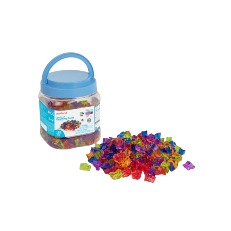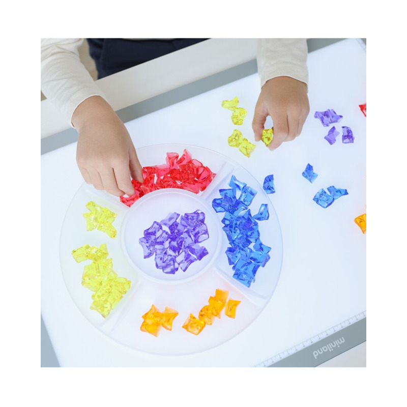 Este set incluye 150 gemas de plástico translúcido en diferentes colores, ideales para contar, clasificar y crear patrones de manera divertida. Su material permite utilizarlas sobre mesas de luz, potenciando la exploración visual y sensorial, y fomentando habilidades matemáticas básicas como la identificación de colores, el conteo y la clasificación.