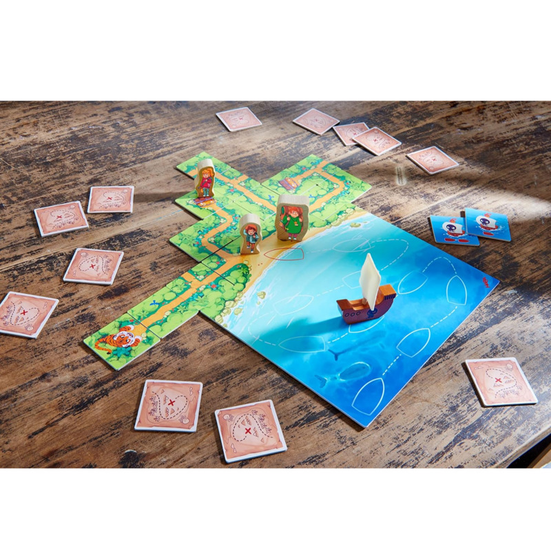 ¡Todos los jugadores/as juntos emprenden una emocionante búsqueda de tesoros en la jungla de la isla de Karuba! ¿Conseguirán colocar las fichas para que llegar a todos los tesoros antes de que los malvados piratas asalten la isla? Deberán trabajar juntos/as y tener cuidado con los tigres que bloquean los caminos. ¡Con habilidad y un poco de suerte serán más rápidos/as que los piratas!
