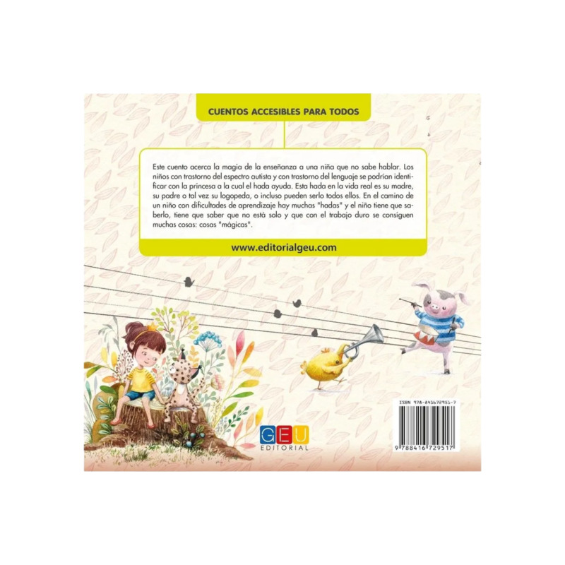 La princesa aprende a hablar es un cuento tierno y esperanzador que acerca a los niños a la magia de la enseñanza y la superación personal. La historia presenta a una princesa que no sabe hablar y a un hada que la acompaña en su camino para conseguirlo, reflejando el proceso de aprendizaje y apoyo que viven muchos niños con TEA.