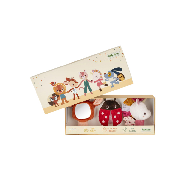 Despierta los sentidos de tu bebé con el encantador set de 3 sonajeros sensoriales de Lilliputiens, diseñado para estimular la vista, el oído y el tacto desde los primeros meses de vida.