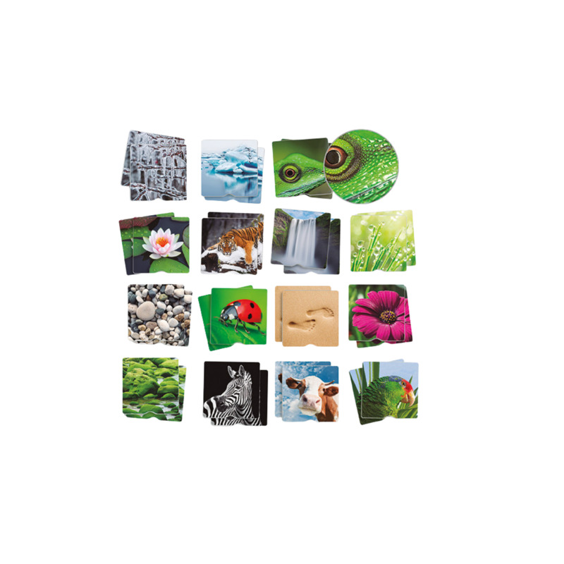 Este memory de gran tamaño combina imágenes reales de la naturaleza con diferentes texturas, permitiendo jugar tanto al memory clásico como al táctil. Favorece la discriminación táctil, la memoria visual y la atención, estimulando el aprendizaje sensorial de forma divertida. Inspirado en la metodología Montessori, promueve la exploración y el desarrollo cognitivo de los más pequeños.