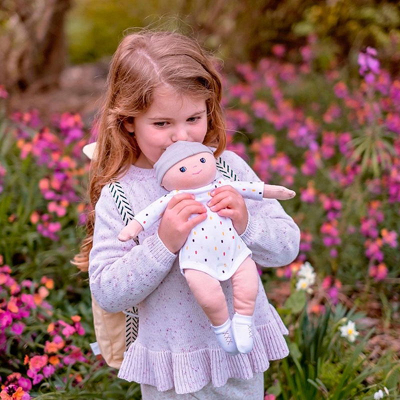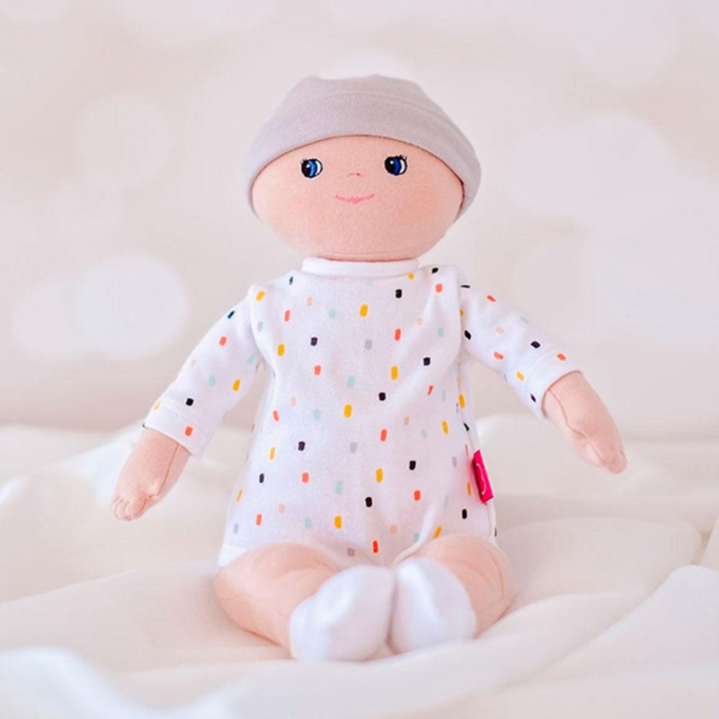 Este muñeco bebé es ideal para que los/las  niños/as jueguen a cuidar y vestir, desarrollando así su motricidad y empatía. Está fabricado con tela suave y detalles bordados para ser abrazados desde los primeros meses. Su diseño de género neutro anima tanto a niños como a niñas a disfrutar del juego simbólico, que favorece el desarrollo emocional y social. Para mantenerlo limpio, solo necesitas un paño húmedo con un poco de jabón. Además, está fabricado con materiales seguros y resistentes, pensado para durar en el tiempo.