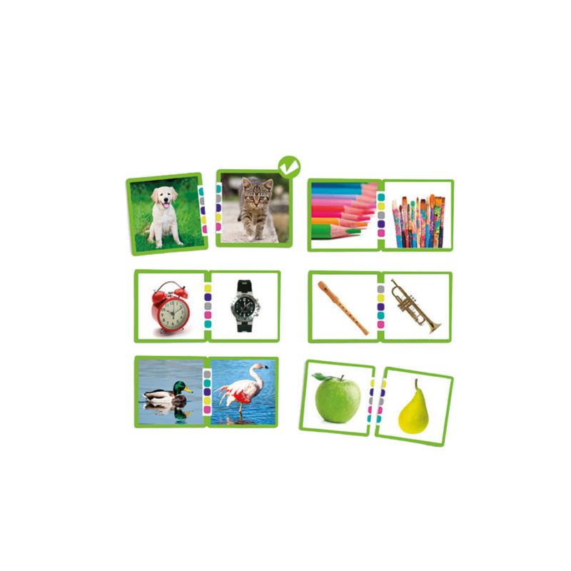 Este juego permite a los niños observar y relacionar parejas de objetos que comparten características en común. Favorece el desarrollo de la atención y la concentración, mejora la memoria y potencia el razonamiento lógico, promoviendo habilidades cognitivas esenciales de forma divertida y educativa.
