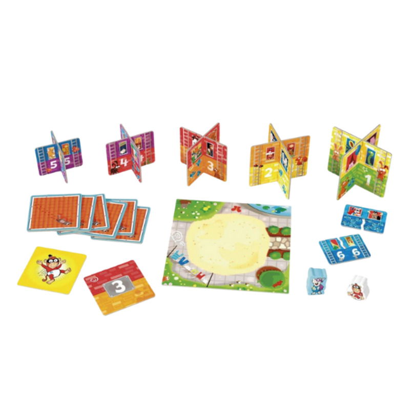 Incluye: tablero de juego, 6 pisos con 2 muros, 8 losetas de tejado, figura de Rhino Hero Junior y su amigo Bebé Mono Araña
