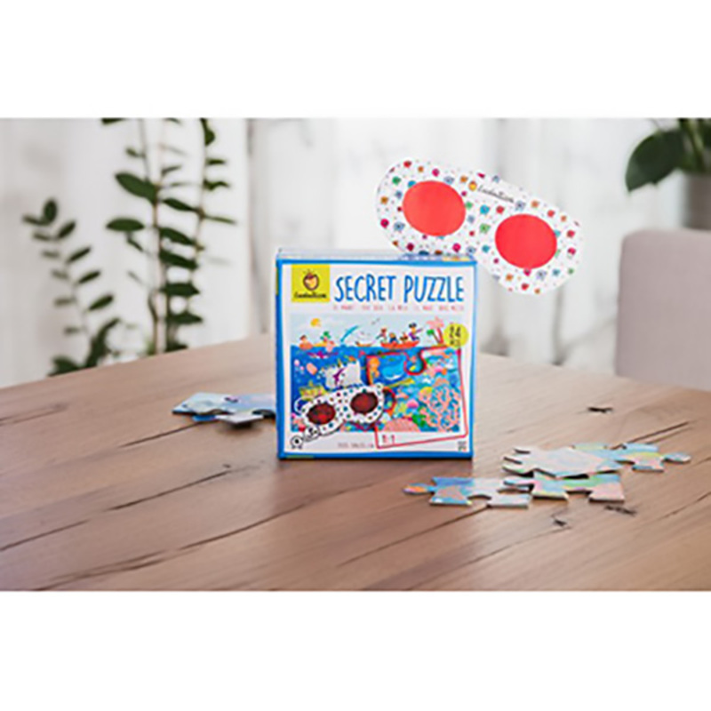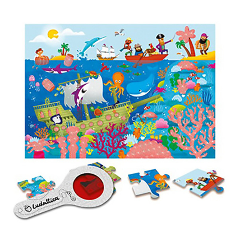 Sumérgete en una aventura submarina con este puzzle de 108 piezas que revela una escena marina. Una vez montado, utiliza la lupa de madera incluida para descubrir elementos ocultos en la imagen, fomentando la observación y la atención al detalle.