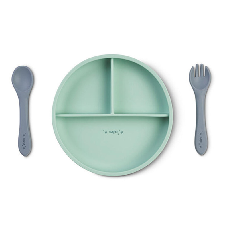 El Set de Alimentación cuenta con un plato de silicona dividido en tres secciones, perfecto para presentar diferentes alimentos de manera atractiva. Su diseño práctico y material seguro lo hacen ideal para las comidas de tu peque.