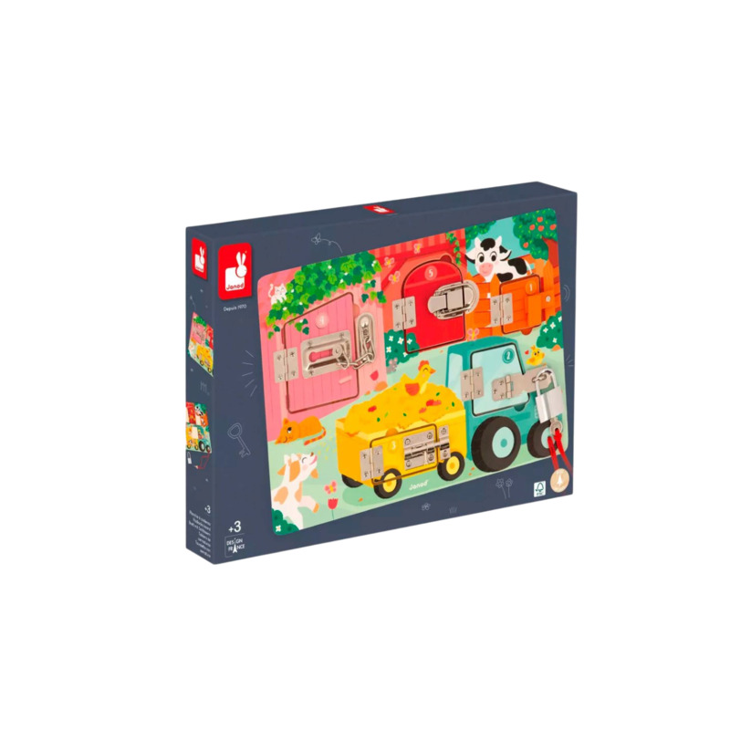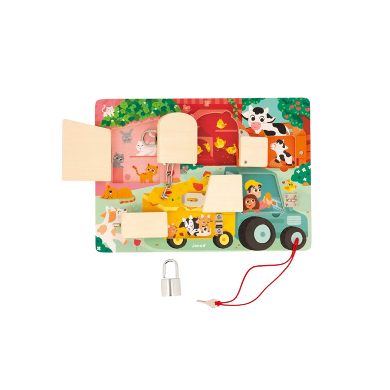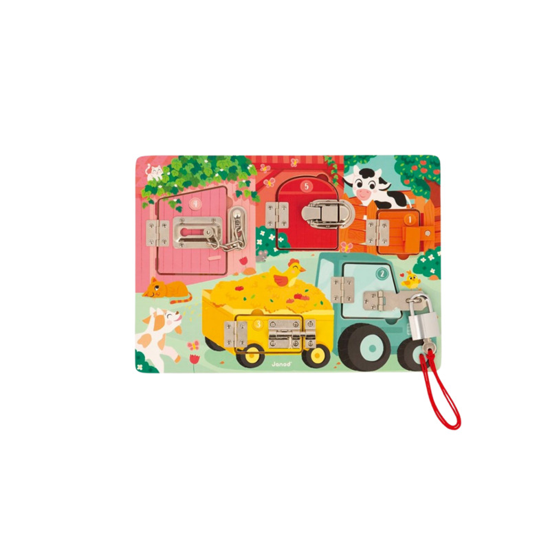El tablero incluye cinco puertas con distintos mecanismos: llave, pestillo, cadena de seguridad, cierre de palanca y cerrojo. Al abrirlas, los niños descubrirán adorables animales de la granja y aprenderán a asociar los números con la cantidad de crías escondidas.
