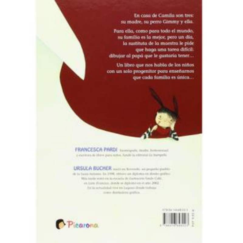En casa de Camila son tres: su madre, su perro Gimmy y ella. Para Camila, su familia es perfecta tal y como es, pero todo cambia cuando en el colegio le piden que dibuje al papá que le gustaría tener. A partir de esta situación, el libro aborda con sensibilidad y naturalidad la realidad de las familias monoparentales, transmitiendo a los niños que no existe un único modelo de familia y que cada una es valiosa a su manera. Una historia emotiva e inclusiva que fomenta el respeto, la diversidad y la autoestima desde la infancia.
