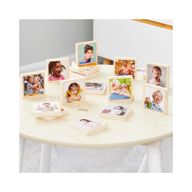 El set de bloques de madera con emociones de TickiT es un recurso educativo ideal para trabajar la educación emocional desde la primera infancia. Incluye 18 bloques cuadrados de madera contrachapada maciza, resistentes y de gran calidad, impresos con fotografías reales de niños que expresan diferentes emociones y sentimientos como felicidad, miedo, enfado, aburrimiento, sorpresa, asco o sueño.