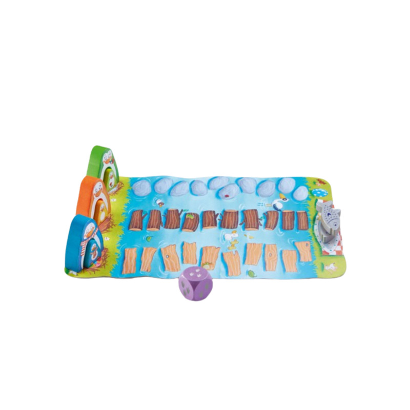Las mamás pingüino viven con sus bebés en una hermosa isla… ¡pero los pescados más sabrosos están en tierra firme! Como los pequeños aún no saben nadar, deberán cruzar el agua saltando sobre rocas, troncos y tablones. Por suerte, las mamás están cerca para ayudarlos: cuando alcanzan a sus bebés, se colocan sobre ellos y los llevan consigo hasta la meta.
